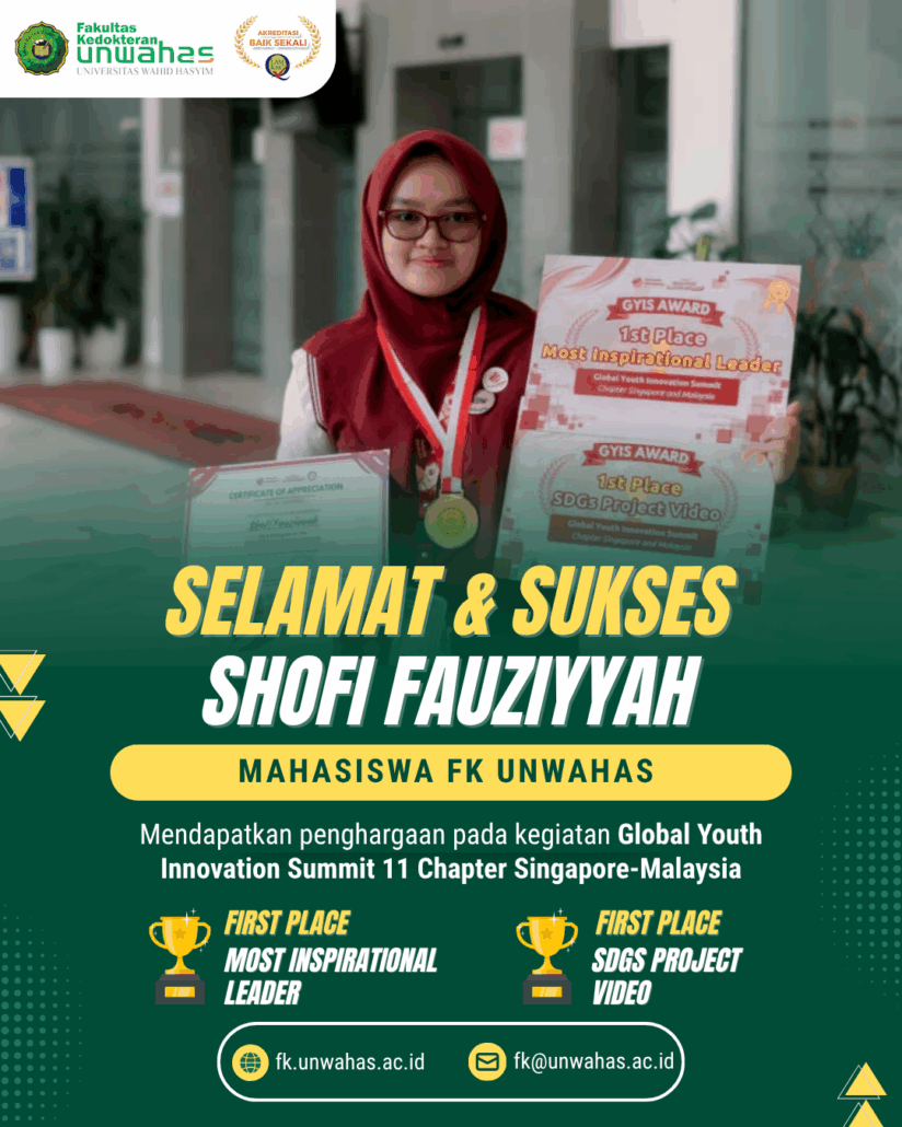 Semarang (FK Unwahas) — Prestasi membanggakan kembali diraih oleh salah satu mahasiswi Fakultas Kedokteran Universitas Wahid Hasyim (FK Unwahas). Shofi Fauziyyah, berhasil menorehkan prestasi gemilang di ajang Global Youth Innovation Summit 11 (GYIS) Chapter Singapore – Malaysia dengan menyabet dua penghargaan bergengsi sekaligus, yaitu First Place Most Inspirational Leader dan First Place SDGs Project Video. 🌍🏆