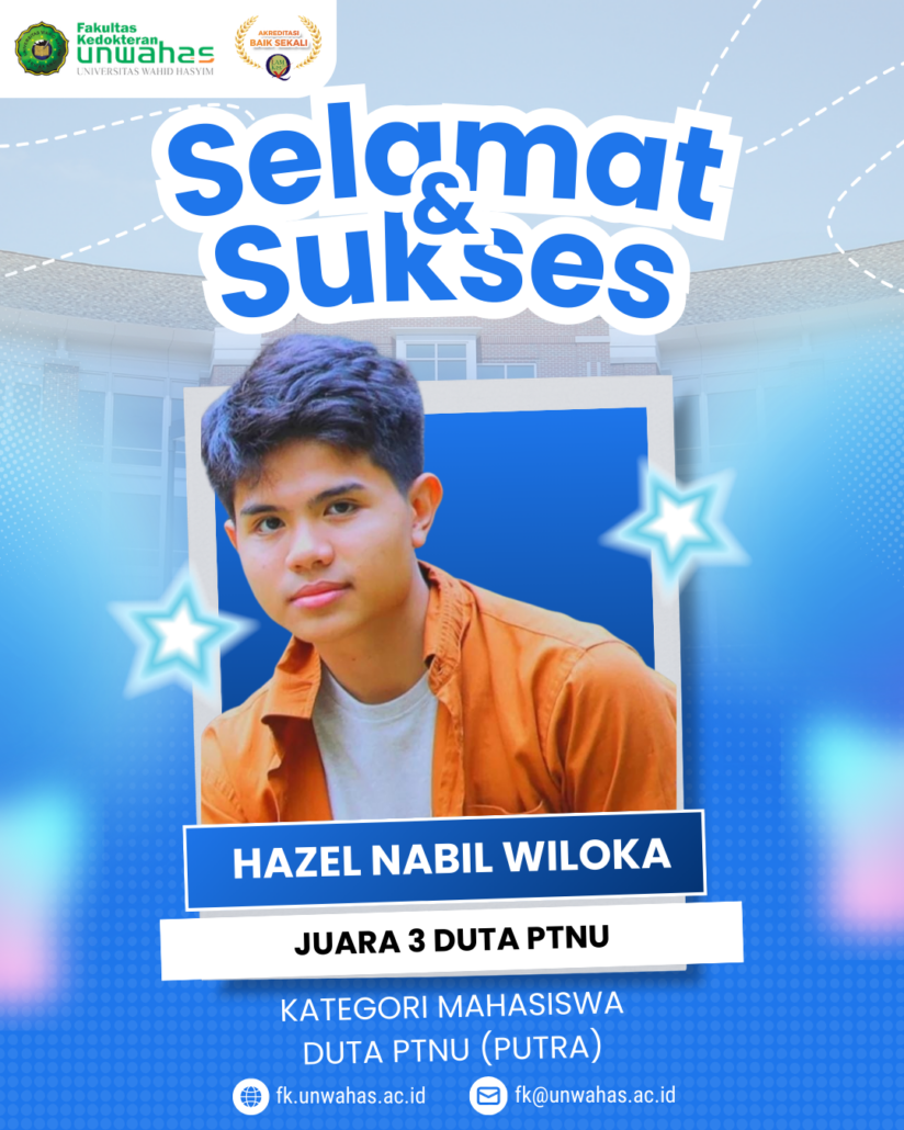Prestasi tingkat nasional kembali diukir oleh mahasiswa Fakultas Kedokteran Universitas Wahid Hasyim (FK Unwahas). Hazel Nabil Wiloka berhasil menempati posisi Juara 3 dalam ajang bergengsi pemilihan Duta Perguruan Tinggi Nahdlatul Ulama (PTNU) Kategori Mahasiswa Putra.